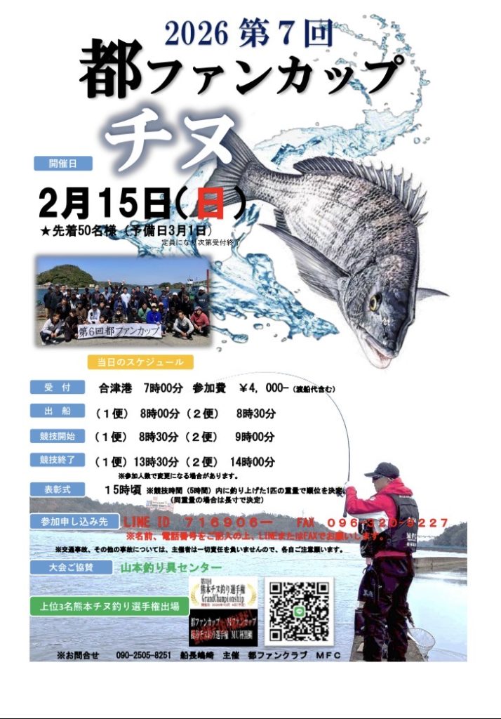 2026 2月 最新釣果情報 第7回 都ファンカップ 2月15日に開催します 2月4日 釣果情報 レンタルボートで桑野さん マダイ65㎝ 磯釣りで武辺さん チヌ45㎝を頭に9匹 磯釣りで田上さん チヌ40㎝が頭に4匹 磯釣りでYouTuberさん チヌ38㎝を頭に5匹 磯釣りで水田さん チヌ40㎝ 磯釣りに殖木さん チヌ35㎝ 2月3日 釣果情報 2月1日 釣果情報 磯釣りで谷本さん チヌ49.5㎝ 磯釣りで山口さん チヌ40㎝を頭に3匹 磯釣りで弓掛さん チヌ40㎝を頭に2匹 磯釣りで西岡さん キビレ Tweet Share この記事のタイトルとURLをコピーする 第21回 海の都・勢力丸チヌ釣りダービー 前の記事